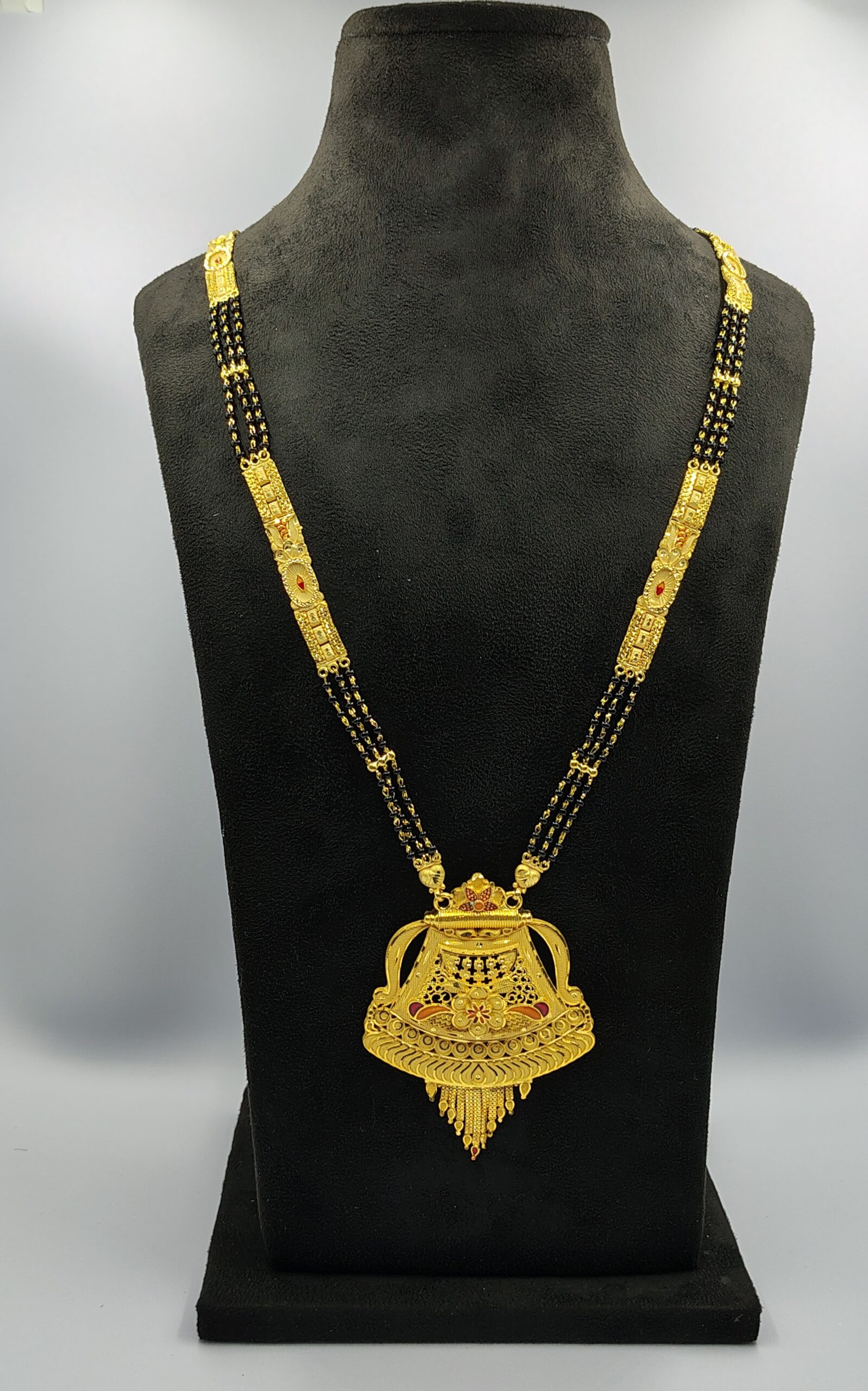 Made using high-quality 1gm forming gold jewellery, this mangalsutra offers the rich look of real gold while being lightweight and comfortable for long wear. The antique-style pendant with traditional motifs and delicate enamel detailing enhances its grandeur, making it a statement piece for weddings, festivals, religious ceremonies, and special occasions.