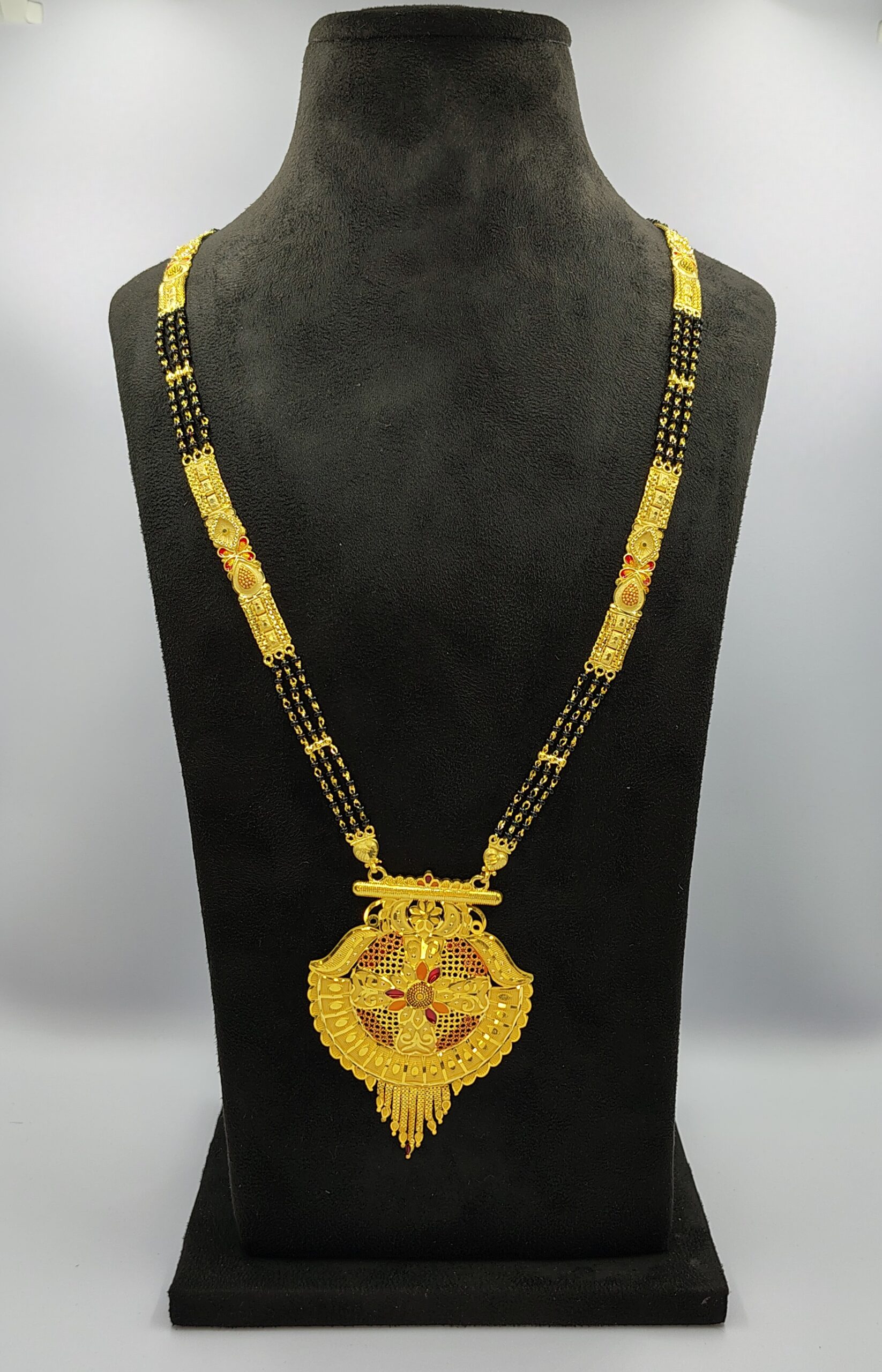 The centerpiece of this mangalsutra is a round floral-inspired pendant, intricately crafted with detailed patterns and highlighted with red enamel work at the center. The pendant is further adorned with fine hanging tassels, giving it a classic and royal appearance. Made using high-quality 1gm forming gold jewellary, this piece delivers the luxurious look of real gold while remaining lightweight, durable, and comfortable for long wear.