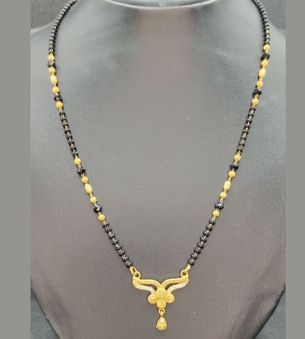 The pendant is perfectly complemented by neatly arranged black beads and gold accents, creating a balanced blend of tradition and modern elegance. Made using premium quality forming gold, this mangalsutra offers the rich appearance of real gold while remaining lightweight, durable, and comfortable for everyday use.